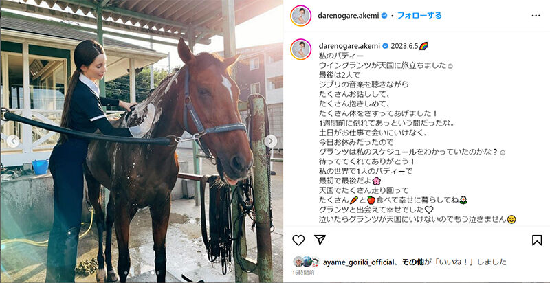 ダレノガレさんはこの日、愛馬とのたくさんの写真を投稿。「私のバディー ウイングランツが天国に旅立ちました」と報告しています。
