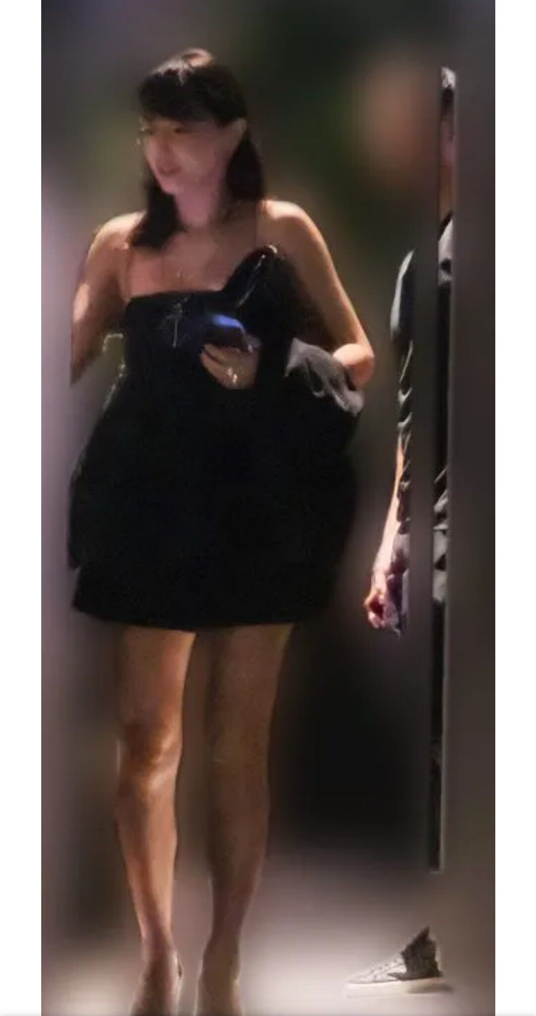 男性は黒のTシャツ&パンツ、スニーカーというカジュアルなスタイルだが、女性は、背中が大きく開いたキャミソールにショートパンツ、クリスチャン・ル*ンのハイヒールと、みずみずしい色気を放ったコーディネート。