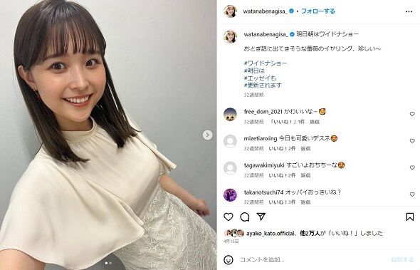 4月時点の渡邊アナ(画像は渡邊渚Instagramから)